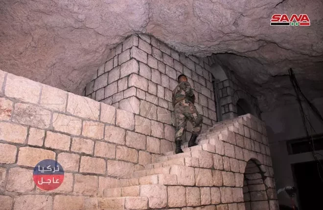 ووثقت الصور التي نشرتها وكالة الأنباء السورية الرسمية، مقر الجولاني المحصن تحت الأرض، يضم غرفا وأنفاقا وخرائط عمليات التنظيم.