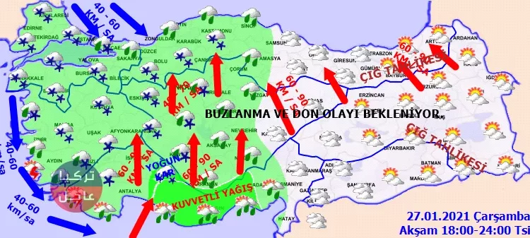 أما الثلوج ستتستقط في المناطق الوسطى والمناطق الغربية من تركيا بدءا من هذه الليلة وهذه الخرائط توضح ذلك.
