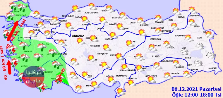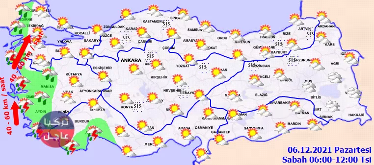 مناطق غرب مرمرة وبحر إيجه وغرب البحر الأبيض المتوسط يتوقع هطول أمطار غزيرة وعواصف رعدية ، كما يتوقع هطولها في الساعات الأولى من مساء اليوم حول موش ، والأجزاء الجنوبية من أغري ، والأجزاء الشمالية من وان وبيتليس ليلاً.