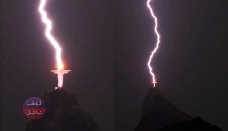 ضربت صاعقة تمثال المسيح في مدينة ريو دي جانيرو الشهيرة ، إحدى مدن البرازيل الرمزية ، المطلة على خليج المدينة .