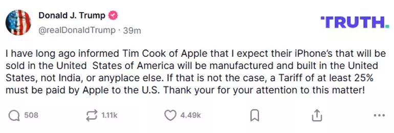 وبحسب ما ترجم موقع تركيا عاجل، نقلاً عن وسائل إعلام أمريكية، فإن ترامب صرّح عبر منصته “تروث سوشيال” قائلاً: “إذا استمرت شركة آبل في تصنيع هواتف آيفون خارج البلاد، فعليها أن تدفع 25% كرسوم جمركية عند دخول منتجاتها إلى السوق الأمريكية”، مضيفًا أن هذه الخطوة تهدف إلى تعزيز التصنيع المحلي وتقليل الاعتماد على الخارج.