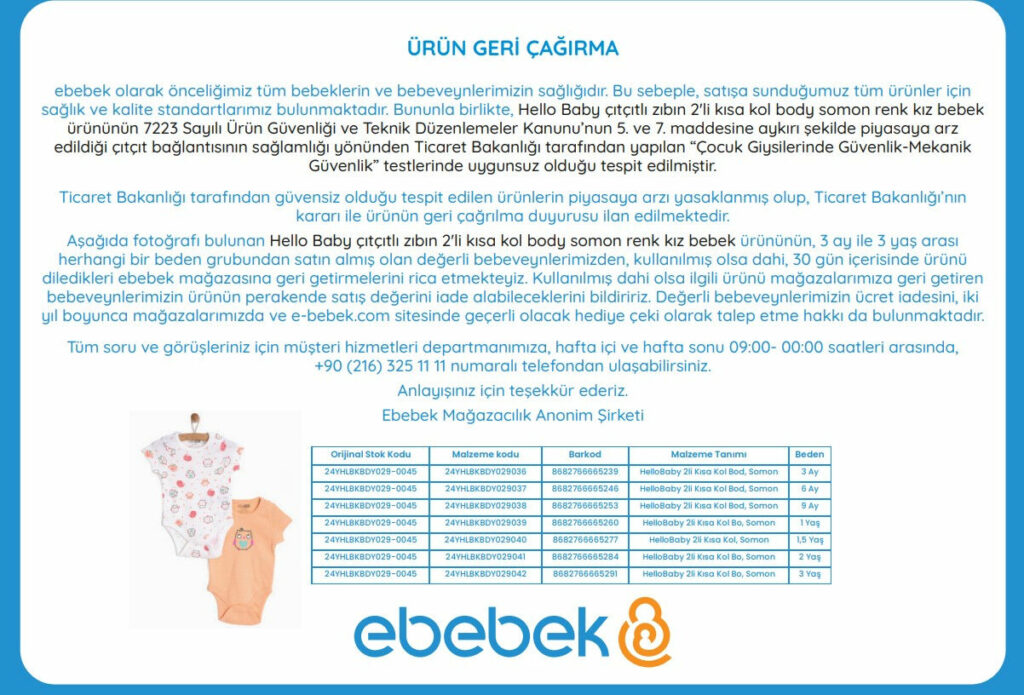 ومن بين هذه المنتجات الخطرة، برز منتج “طقم القميص الداخلي بأكمام قصيرة عدد 2 – موديل للفتيات” من علامة Hello Baby، والذي يُباع في متاجر E-Bebek، إحدى أبرز الشركات المتخصصة في منتجات الأم والطفل في تركيا. وقد أصدرت الشركة بياناً تعلن فيه سحب المنتج من السوق استجابة للقرار.