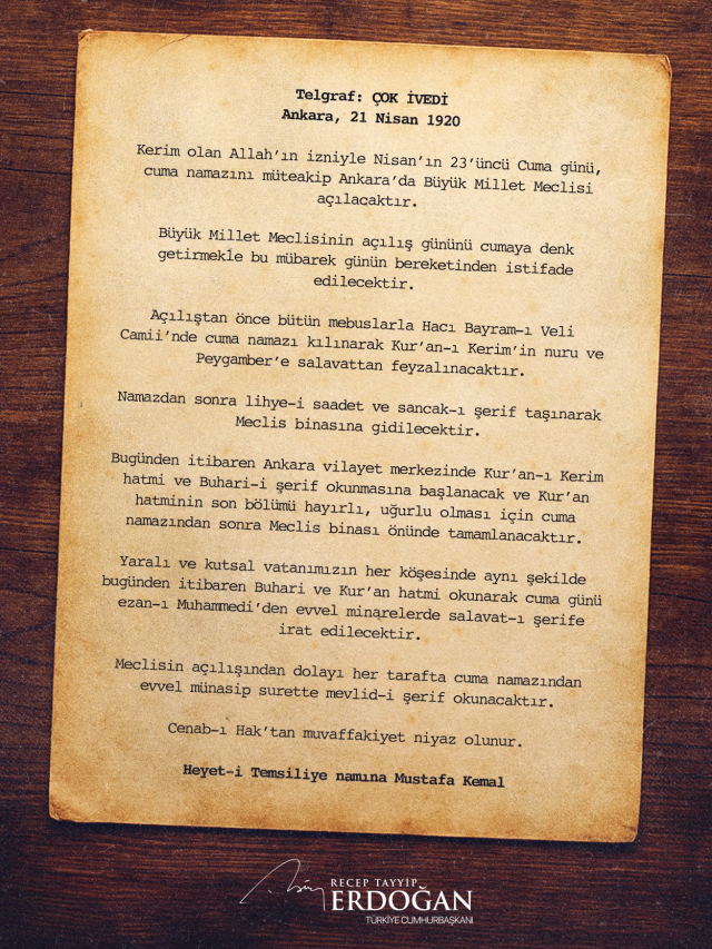 “من المهم أن نذكّر أولئك الذين يجهلون كيف تأسست الجمهورية التركية، وما الأسس التي قامت عليها، وكيف تم افتتاح البرلمان. هذه البرقية توضح بجلاء الإرادة التي أنشأت هذا الوطن.”