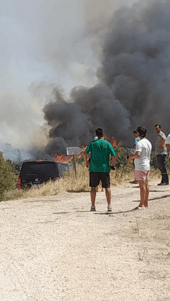 وشوهدت أعمدة كثيفة من الدخان تغطي سماء المنطقة، حيث يمكن رؤية الدخان من عدة كيلومترات، بينما تواصل فرق الإطفاء التابعة لمديرية الغابات ومديرية الإطفاء محاولاتها الحثيثة لإخماد النيران، مستخدمة مزيجًا من الطائرات والمروحيات والمركبات الأرضية.