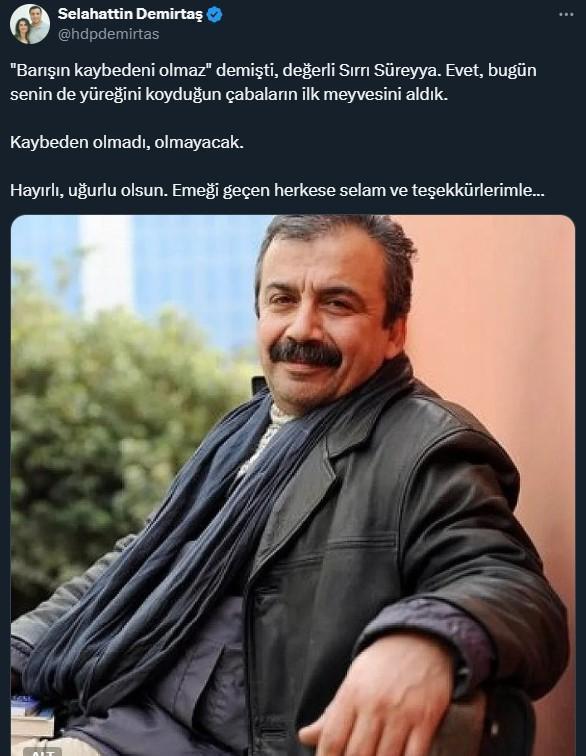 وبحسب ما ترجم موقع تركيا عاجل، نقلاً عن الإعلام التركي، فقد نشر دميرطاش عبر حسابه في وسائل التواصل الاجتماعي رسالة تضمنت صورة للسياسي الكردي صرّي سريّا أوندر، وكتب فيها: