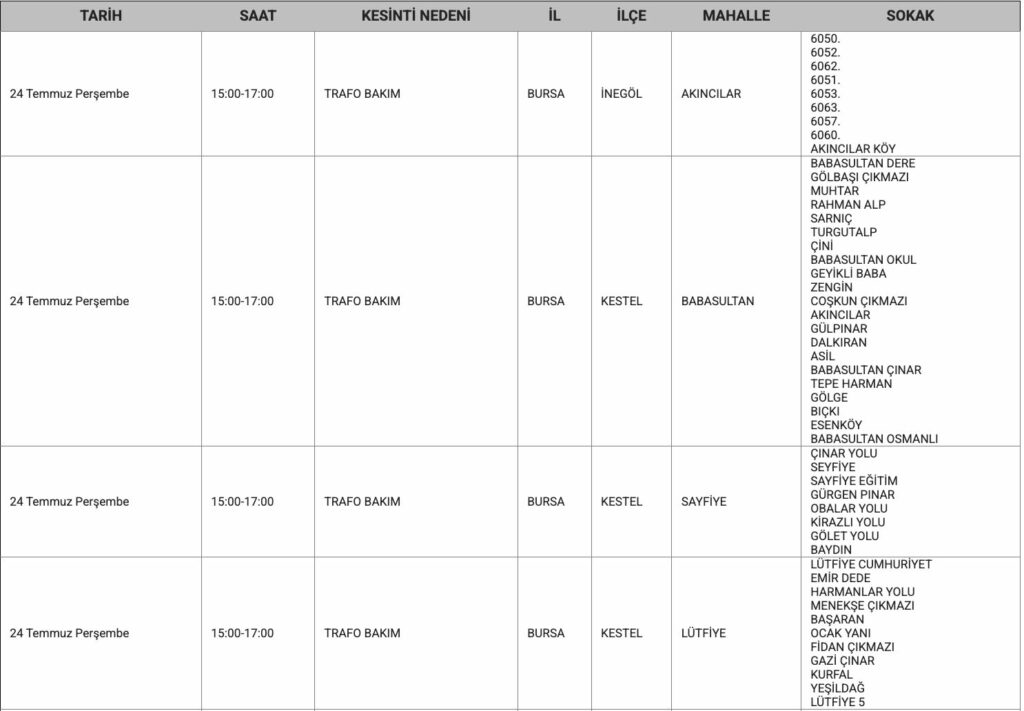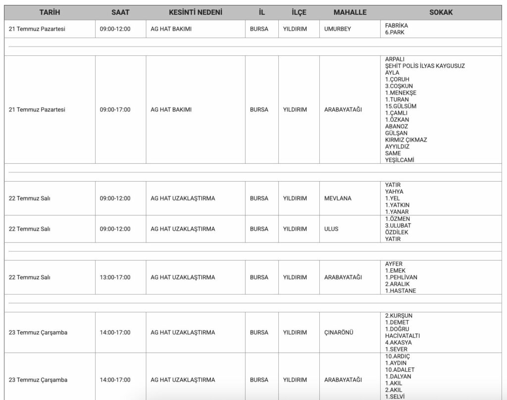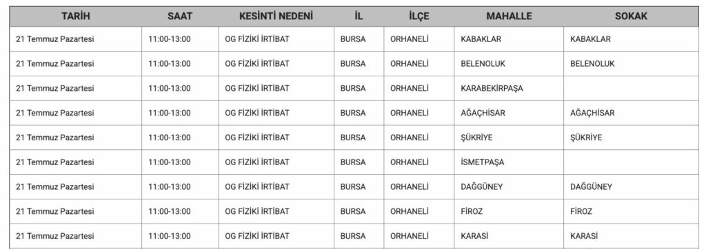 الانقطاع المبرمج سيؤثر على مناطق: بويوك أورهان، جملك، غورسو، إينيغول، إزنيك، كيليس، كيستل، مودانيا، مصطفى كمال باشا، نيلوفر، أورهانلي، أورهان غازي، عثمان غازي، يني شهير، ويلدريم. وسيتم تنفيذ القطع بشكل متناوب في الأحياء والشوارع المختلفة حسب خطة UEDAŞ الرسمية.